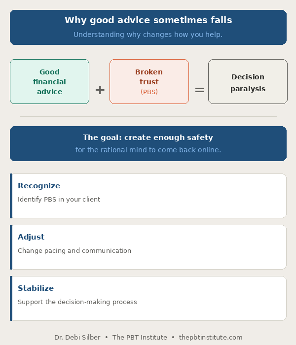 The professionals who find this framework most useful are the ones who’ve been asking: “Why isn’t this client responding to good advice?” The answer is almost always trust disruption — not a lack of understanding, not stubbornness, not bad faith.